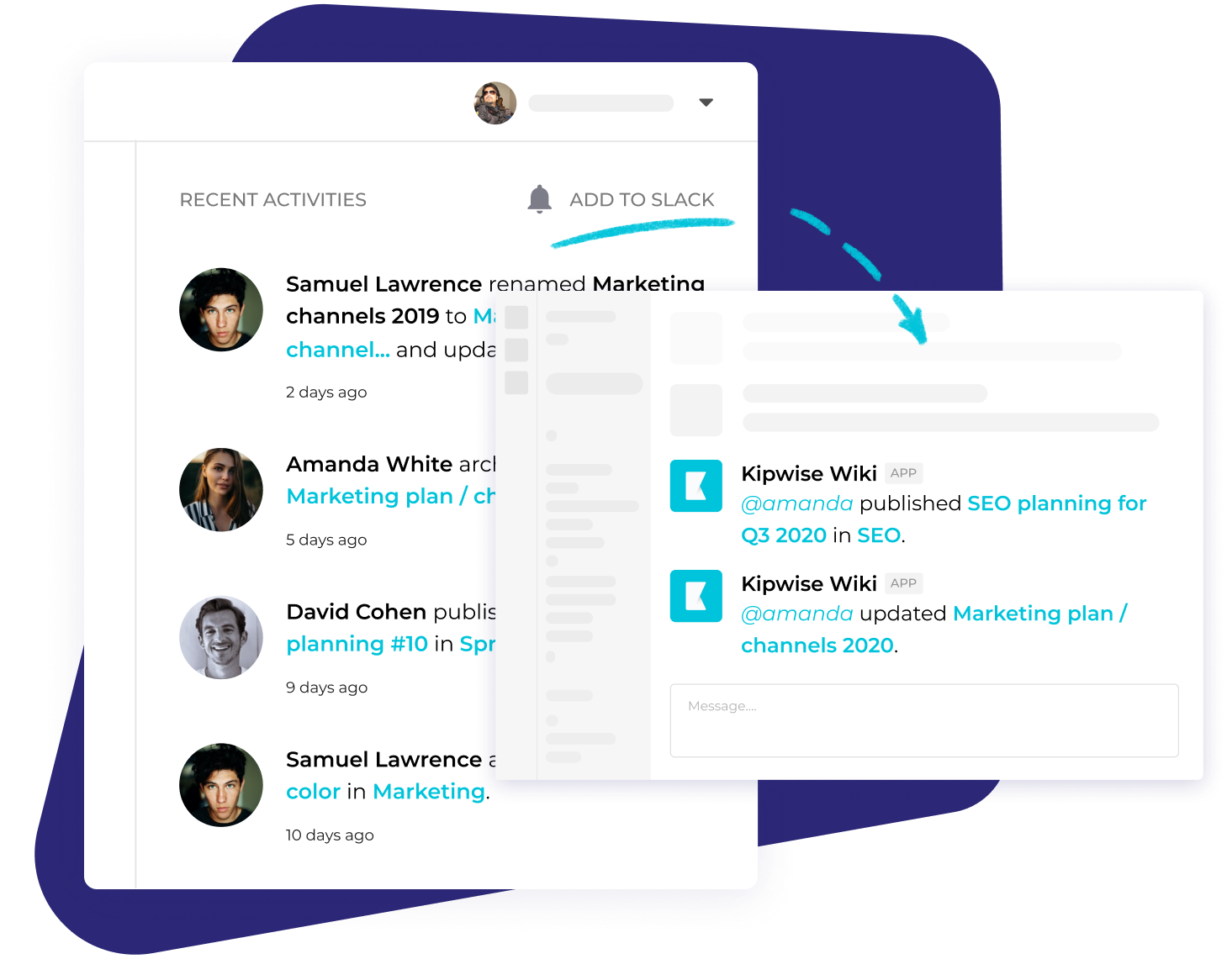 To keep your teammates engaged and help them find new and interesting knowledge, you can link your activity feeds to Slack to receive notifications where there are new content or updates.