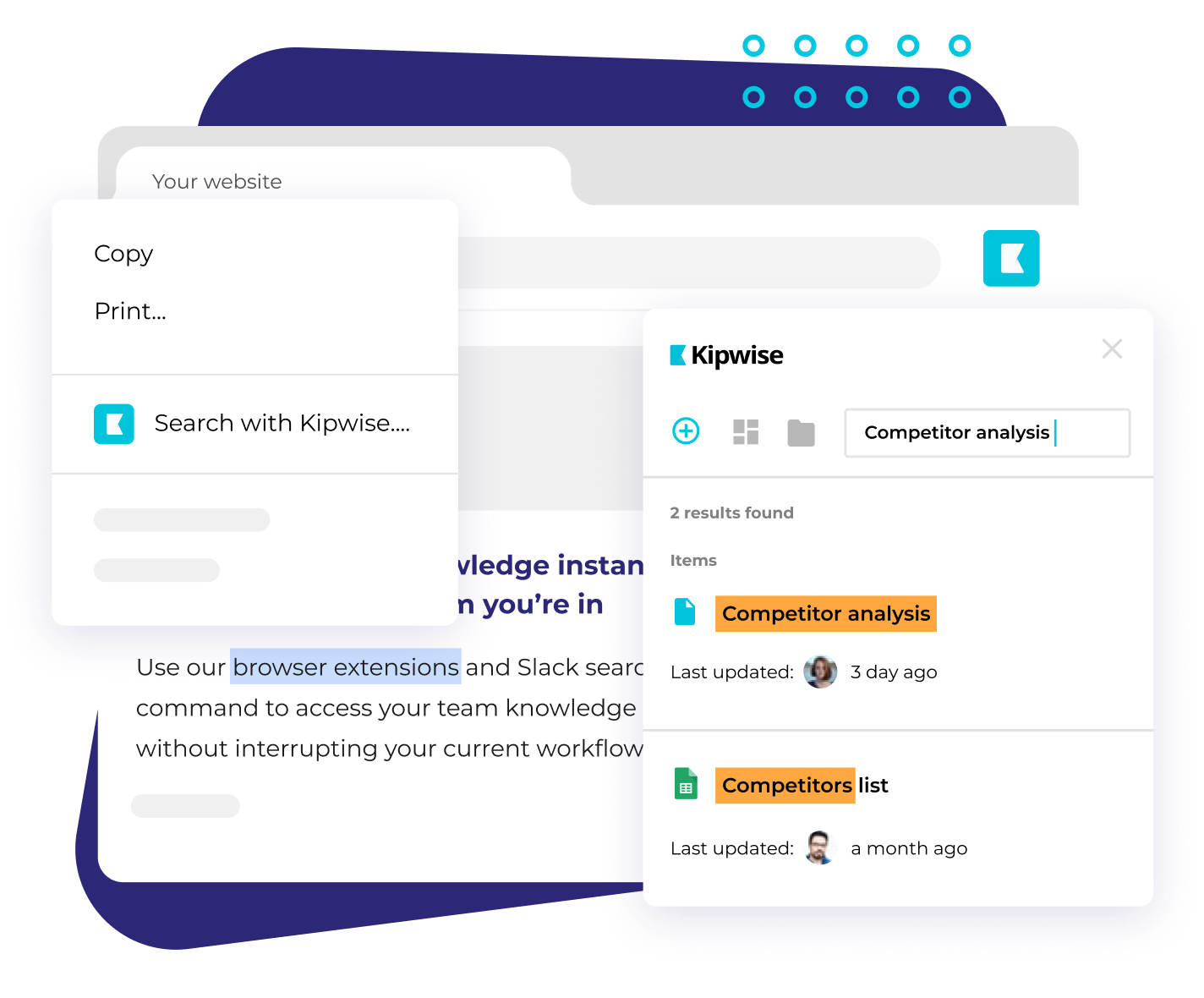 Gain quick access to your company’s internal knowledge hub via the Kipwise Safari extension. Simply highlight any text on a web page to perform a quick search and surface the information you need fast while working in any web app.