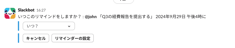 つまり、日本語で日時を入力してもSlackはそれを認識せず、「いつリマインドしますか?」と聞かれることになります。