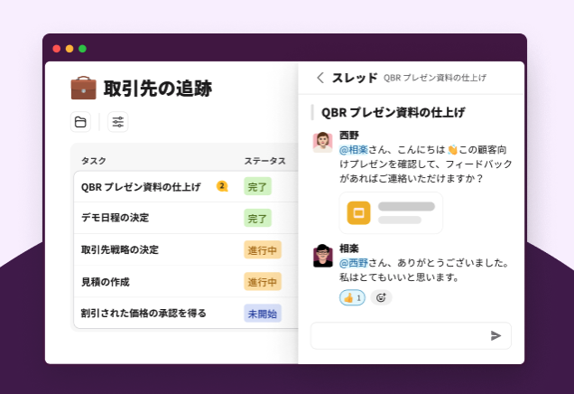 概要: Slackのタスクリスト機能を使えば、アプリを切り替えることなく、Slack内で直接プロジェクトやタスクを管理できます。Slackの会話から重要な情報を整理し、締め切りやリソースの管理がスムーズになります。