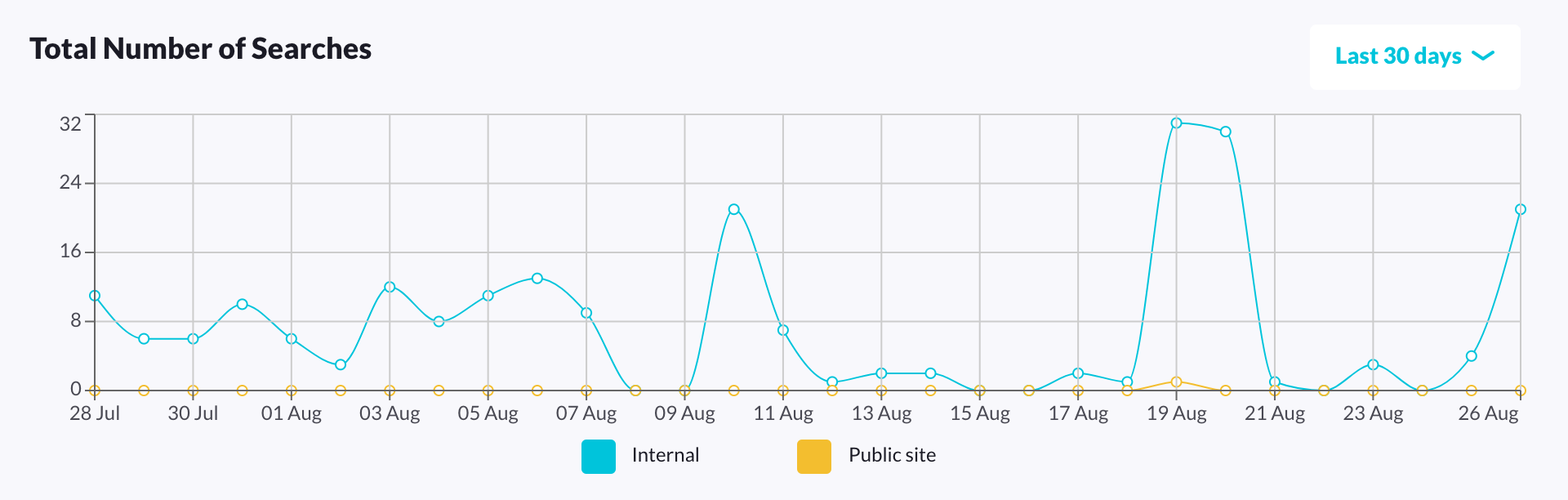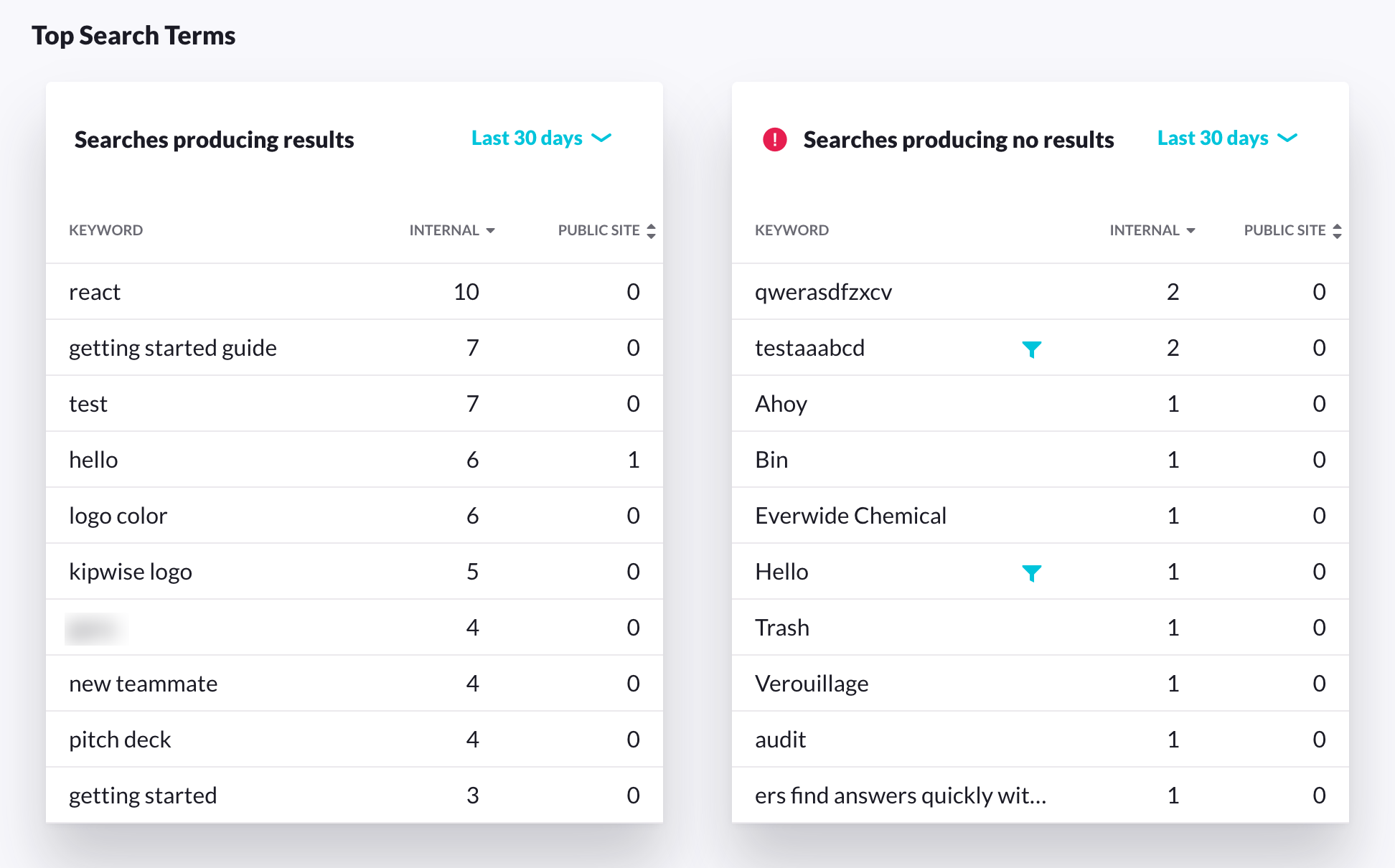 For example, on Kipwise, other than showing you the search healthiness (i.e. % of searches that have relevant results), you can also see the top search terms that produce results vs. no results.