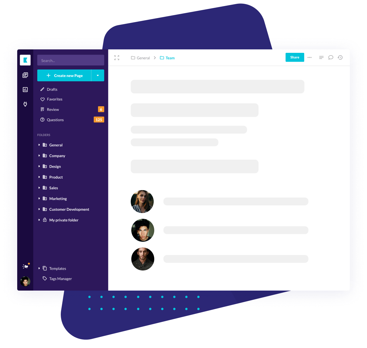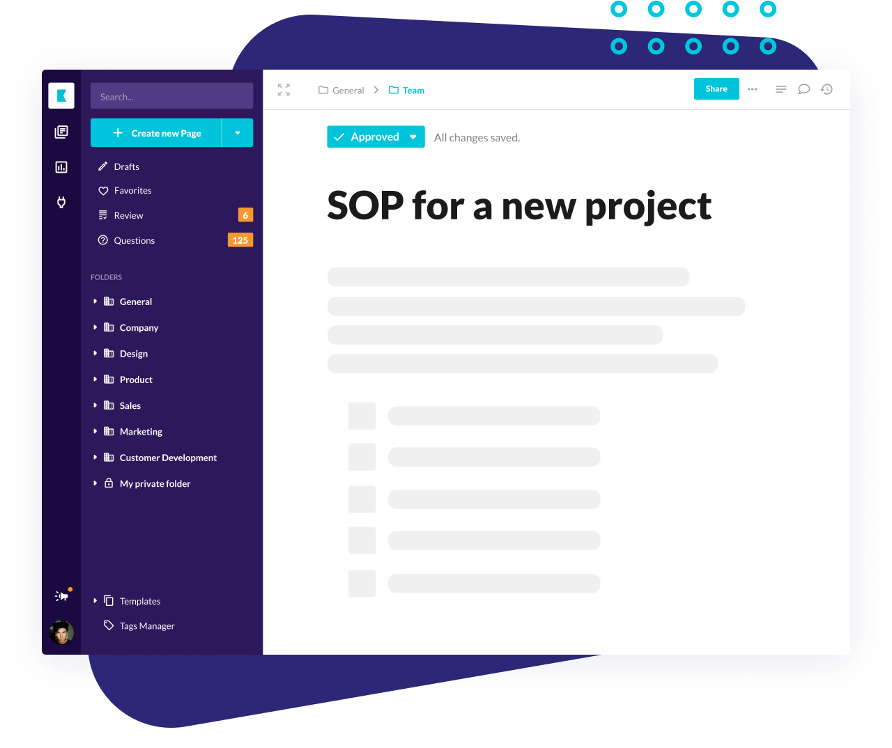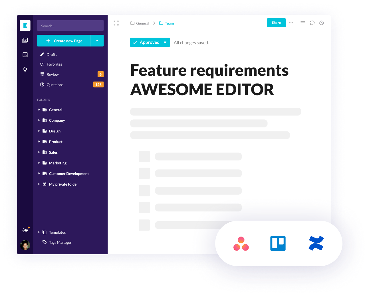 Collaborate on product specs, product roadmap and share best practices and user feedback. Document test results and analytics so your team and future hires can learn from the experience.
